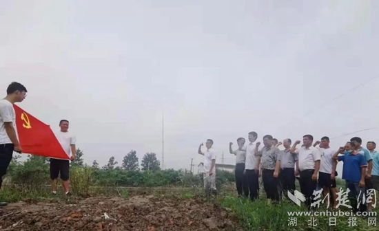 社區(qū)黨員干部在防汛一線重溫入黨誓詞。(通訊員供圖)