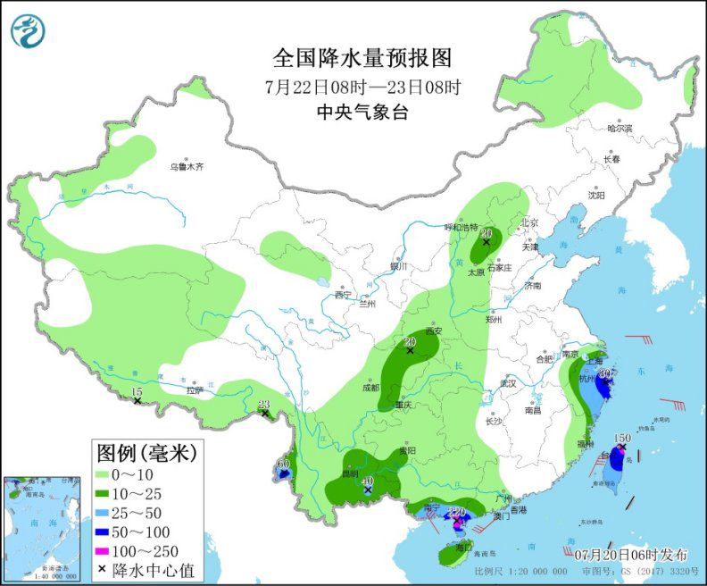 7月22日08時至23日08時,華北北部、西北地區(qū)東南部、西南地區(qū)東部、西南地區(qū)南部、華南南部、海南島、臺灣島等地部分地區(qū)有中到大雨,其中,浙江東部、云南西南部、廣西東南部、廣東西南部、臺灣島北部等地部分地區(qū)有暴雨或大暴雨(100~220毫米)。華南南部沿海、浙江東部沿海、臺灣海峽等地將有6~8級大風。