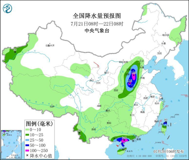 7月20日08時至21日08時,河北南部、山西南部、河南中北部、陜西南部、湖北西部、四川盆地東部、湖南北部、云南南部以及廣東南部等地的部分地區(qū)有大到暴雨,其中,山西南部、河南西北部、廣東西南部沿海等地局部地區(qū)有大暴雨(100~200毫米)。上述部分地區(qū)伴有短時強降水(最大小時降雨量30~50毫米,局地可超過70毫米),局地有雷暴大風等強對流天氣。內(nèi)蒙古西北部、青海北部等地部分地區(qū)有5~7級風。廣東南部沿海將有6~8級大風。
