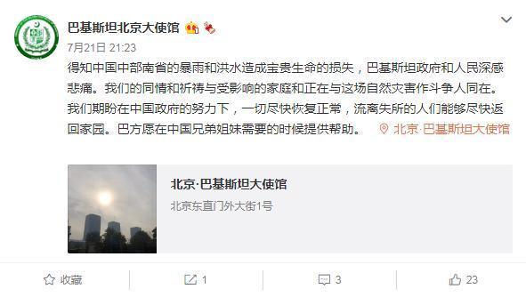 巴基斯坦駐華大使館也表達(dá)了對(duì)河南災(zāi)情的關(guān)切,在微博上寫道,得知中國(guó)河南省的暴雨和洪水造成寶貴生命的損失,巴基斯坦政府和人民深感悲痛?!拔覀兤谂卧谥袊?guó)政府的努力下,一切盡快恢復(fù)正常,流離失所的人們能夠盡快返回家園。巴方愿在中國(guó)兄弟姐妹需要的時(shí)候提供幫助?!?/p>