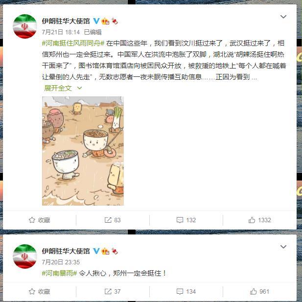 伊朗駐華大使館稱,“在中國(guó)這些年,我們看到汶川挺過(guò)來(lái)了,武漢挺過(guò)來(lái)了,相信鄭州也一定會(huì)挺過(guò)來(lái)?!?/p>