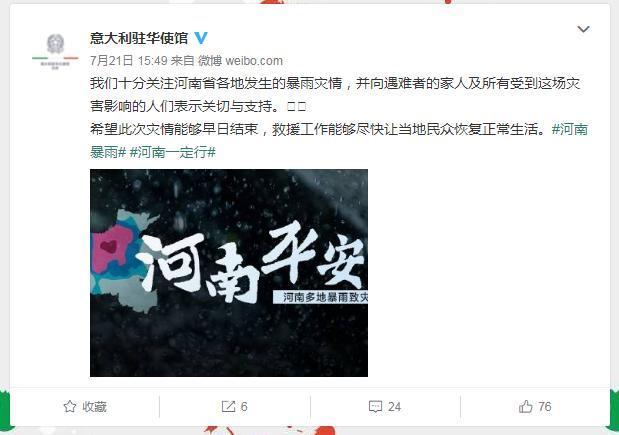 同日,意大利駐華大使館也發(fā)文稱,希望此次災(zāi)情能夠早日結(jié)束,救援工作能夠盡快讓當(dāng)?shù)孛癖娀謴?fù)正常生活?!拔覀兪株P(guān)注河南省各地發(fā)生的暴雨災(zāi)情,并向遇難者的家人及所有受到這場(chǎng)災(zāi)害影響的人們表示關(guān)切與支持。”