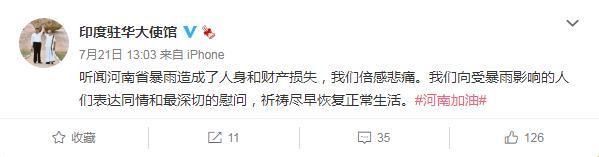 印度駐華大使館表示,“聽(tīng)聞河南省暴雨造成了人身和財(cái)產(chǎn)損失,我們倍感悲痛。我們向受暴雨影響的人們表達(dá)同情和最深切的慰問(wèn),祈禱盡早恢復(fù)正常生活?!?/p>