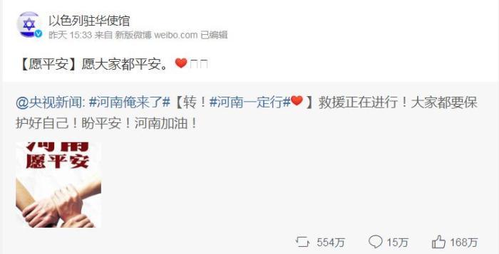 此外,以色列駐華大使館轉(zhuǎn)發(fā)了“河南加油”的相關(guān)微博,并祈禱稱,“愿大家都平安?!?/p>