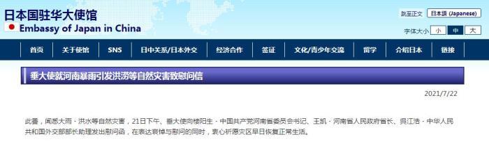 另?yè)?jù)日本駐華大使館網(wǎng)站22日消息,日本駐華大使垂秀夫就河南暴雨引發(fā)洪澇等自然災(zāi)害,向中方表達(dá)哀悼與慰問(wèn),并衷心祈愿災(zāi)區(qū)早日恢復(fù)正常生活。