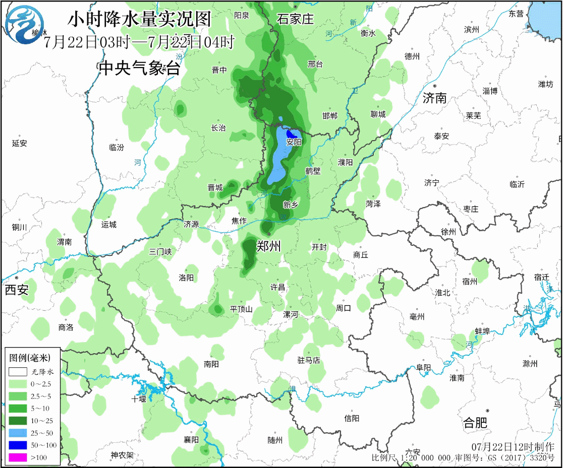 氣象部門統(tǒng)計(jì),22日8時(shí)至14時(shí),河南西北部、河北中部和西南部、山西東南部等地部分地區(qū)出現(xiàn)大雨或暴雨,河南安陽、焦作、新鄉(xiāng)和山西晉城等地局地大暴雨(100~132毫米)。不過,中央氣象臺(tái)22日下午接近16時(shí)發(fā)布的消息顯示,過去12小時(shí),河南逐小時(shí)降雨量動(dòng)圖,可以看到降雨慢慢減弱。