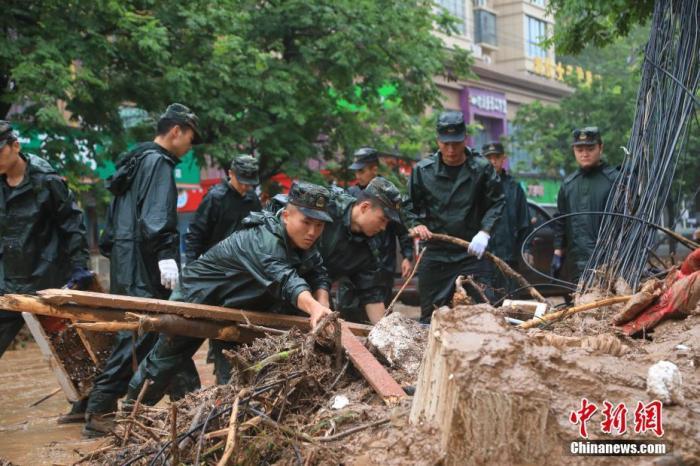 7月21日,武警官兵在河南省鞏義市米河鎮(zhèn)街道上清理雜物。 中新社發(fā) 蔡霖偉 攝