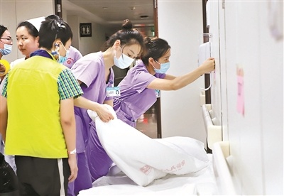 按照醫(yī)院部署,醫(yī)務(wù)、護(hù)理、院辦、后勤保障等多部門及臨床科室連夜行動(dòng),科學(xué)調(diào)度床位,全力保障轉(zhuǎn)運(yùn)病人安全。128個(gè)病區(qū)護(hù)士長(zhǎng)及值班護(hù)士參與完成加床用品清點(diǎn)及籌備,由各位護(hù)士長(zhǎng)、護(hù)理部干事以及相關(guān)病區(qū)準(zhǔn)備好1100多個(gè)病床單元,做好迎接轉(zhuǎn)運(yùn)患者的準(zhǔn)備。后勤保障部集中調(diào)配水泵、照明燈、沙袋等防汛物資,調(diào)配數(shù)百?gòu)埐〈玻?0人隊(duì)伍對(duì)全院重點(diǎn)部位做好防水工程,改造相關(guān)病房及改造升級(jí)部分ICU病房。