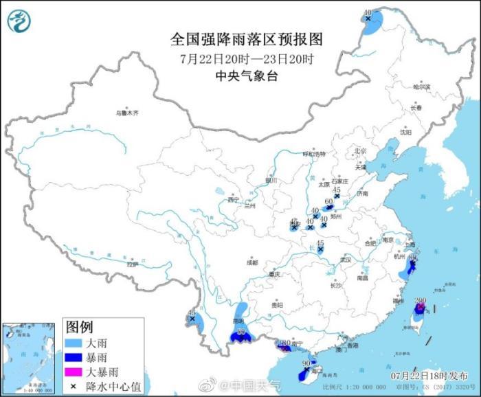 全國強(qiáng)降雨落區(qū)預(yù)報(bào)圖。(7月22日20時(shí)-23日20時(shí))