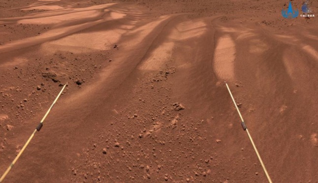 火星車行駛至巡視探測途中的一處沙丘,拍攝了由風成、風積作用形成的沙丘地貌圖像。