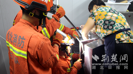 荊楚網(湖北日報網)訊(通訊員黃消宣)7月22日凌晨4時許,黃石市下陸區(qū)一包子店內,一名女子左手被卡進了正在運轉的壓面機,無法動彈,情況十分緊急。黃石消防救援支隊接警后立即調派轄區(qū)幸福消防站1臺搶險救援車,6名消防人員趕往現(xiàn)場展開救援。