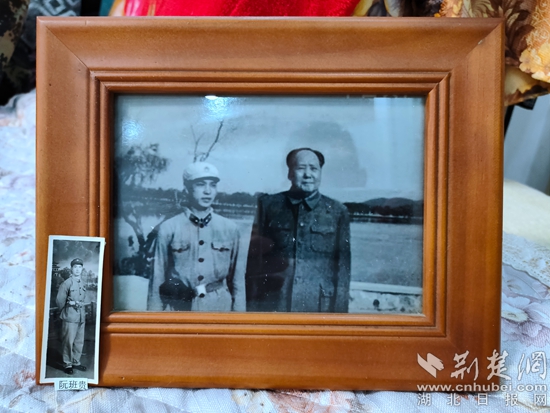 23日中午12時許,記者在咸寧城區(qū)溫泉麓山小鎮(zhèn)見到了現(xiàn)年77歲的阮班貴老人。在老人客廳酒柜正中央的一個小格子里,擺放著一個棕色邊框的像框格外引人注目。照片里,毛主席面帶微笑,身穿軍裝腰間佩戴手槍的阮班貴開心地注目前方。