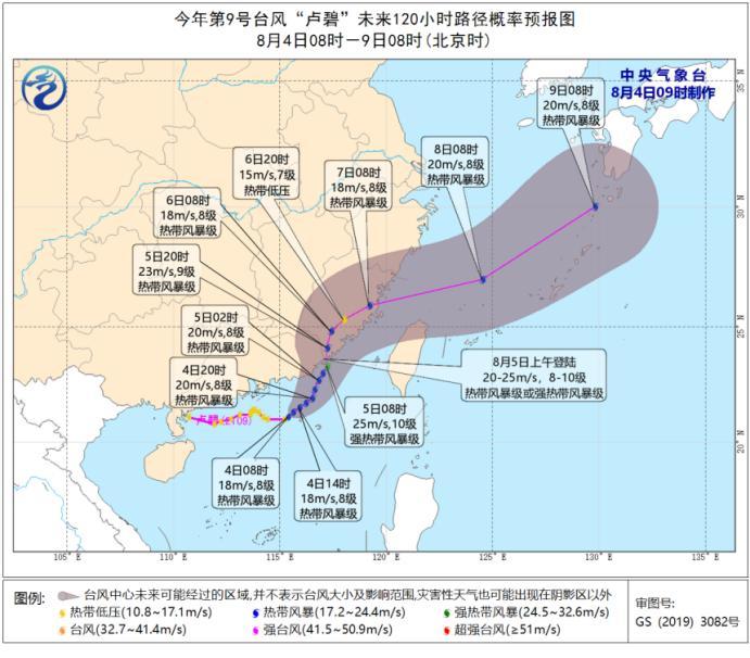 預(yù)計,“盧碧”將以每小時10公里左右的速度向東偏北方向移動,5日上午在廣東陸豐到福建晉江一帶沿海登陸(熱帶風(fēng)暴級或強(qiáng)熱帶風(fēng)暴級,8-10級,20-25米/秒),登陸后強(qiáng)度有所減弱,并將于7日白天移入東海南部海面,逐漸向東北方向移動。