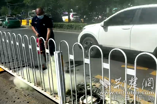 當(dāng)天上午9時50分,黃石市下陸區(qū)消防人員在轄區(qū)開展消防安全檢查時,發(fā)現(xiàn)桂林南路靠近婦幼保健院一側(cè)道路中間中間冒出滾滾濃煙。對此,消防人員迅速展開撲救,經(jīng)過約3分鐘的處置,道路中間的明火被撲滅。