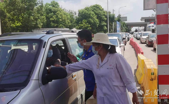 在九江長江一橋黃梅小池出口,工作人員對入梅車輛進(jìn)行檢查測溫。通訊員 供圖