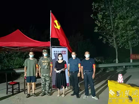 在勝利鎮(zhèn)松子關(guān)省際卡口,由鎮(zhèn)村組成的志愿者隊(duì)伍克服酷熱,晝夜嚴(yán)格排查過(guò)往司乘車(chē)輛,摸排中高風(fēng)險(xiǎn)地區(qū)來(lái)羅返羅人員,在他們身后,鮮艷的黨旗迎風(fēng)飄揚(yáng)。