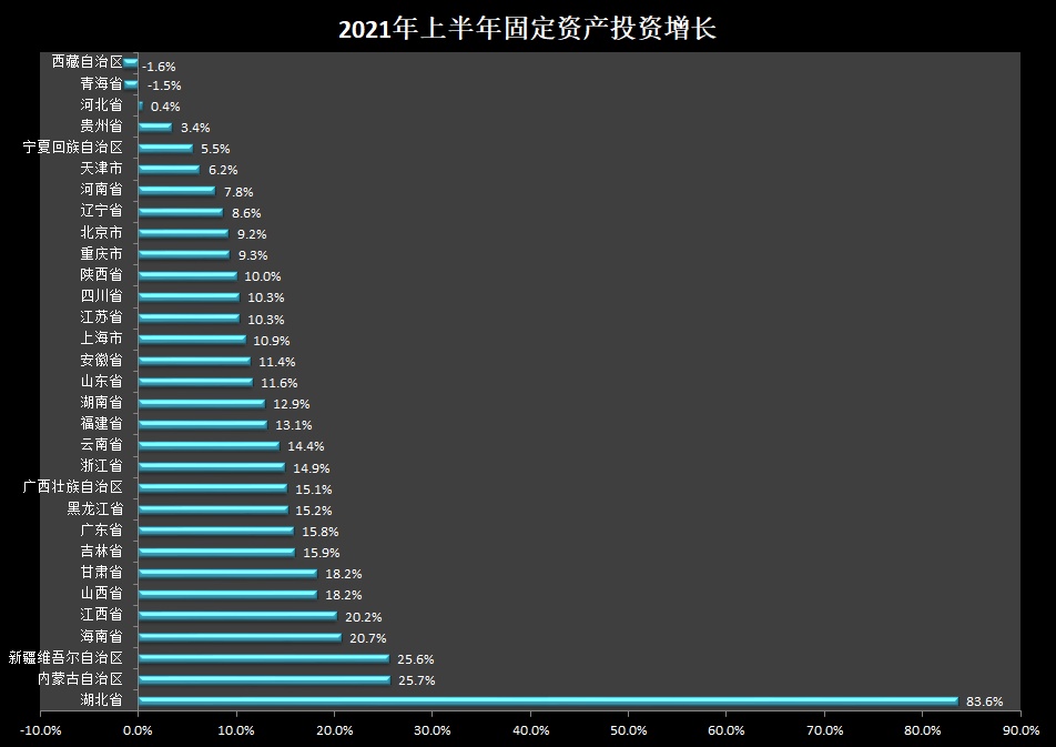 由于疫情原因,2020年上半年各地投資受到不同程度的影響,湖北去年上半年投資增速下降56.2%,在基數(shù)的影響下,今年上半年湖北數(shù)據(jù)反彈明顯。