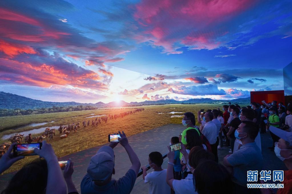 7月15日,觀眾在中國共產(chǎn)黨歷史展覽館“‘不忘初心、牢記使命’中國共產(chǎn)黨歷史展覽”上觀看紅軍長征過草地場景視頻。新華社記者 陳曄華 攝