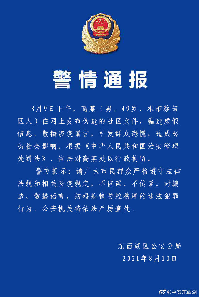 中新網(wǎng)8月10日電 據(jù)武漢市公安局東西湖區(qū)分局官方微博消息,8月10日,武漢市東西湖區(qū)公安分局發(fā)布警情通報指,9日下午,高某(男,49歲,本市蔡甸區(qū)人)在網(wǎng)上發(fā)布偽造的社區(qū)文件,編造虛假信息,散播涉疫謠言,引發(fā)群眾恐慌,造成惡劣社會影響。根據(jù)《中華人民共和國治安管理處罰法》,依法對高某處以行政拘留。