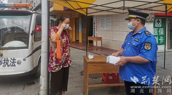 紅安縣城管執(zhí)法隊(duì)員向市民發(fā)放口罩。通訊員供圖