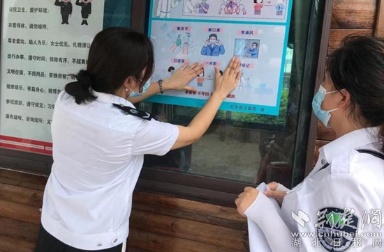 紅安縣文化市場(chǎng)綜合執(zhí)法大隊(duì)工作人員在娛樂場(chǎng)所張貼通告。通訊員供圖