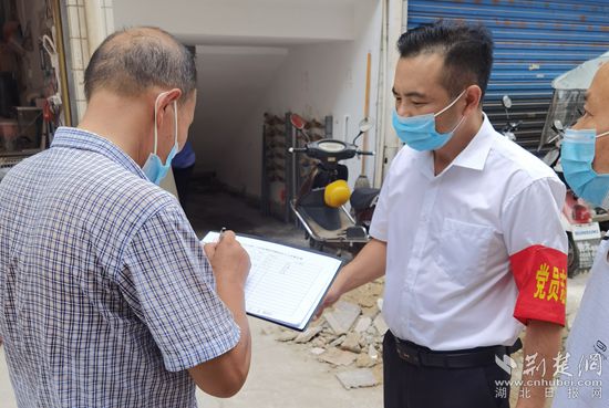 “麻煩您出示健康碼,掃描行程碼查看近期形成途徑地?!痹谠摽h黃梅府小區(qū),縣鄉(xiāng)村振興局下沉黨員深入各樓棟住戶上門登記。