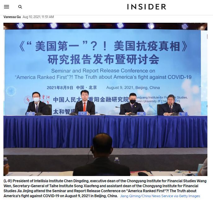 美國知名全球數(shù)字媒體平臺(tái)Insider在8月10日發(fā)表《彭博社6月份稱美國抗疫排名世界第一后,3家中國智庫對(duì)其進(jìn)行抨擊》一文,詳細(xì)介紹了報(bào)告內(nèi)容,并直接關(guān)聯(lián)了人大重陽研究院官網(wǎng)的英文版PDF報(bào)告鏈接。Insider指出,該報(bào)告在分析美國抗疫措施時(shí)主要參考了包括《紐約時(shí)報(bào)》《華盛頓郵報(bào)》和CNN在內(nèi)的美國媒體資訊。報(bào)告概述了美國抗疫的失敗,指出了日益擴(kuò)大的貧富差距、系統(tǒng)性的種族主義和在槍支管制方面的失敗,并直接轉(zhuǎn)引報(bào)告原句“美國在病毒溯源問題上搞‘有罪推定’,是企圖操縱‘全球輿論’”。