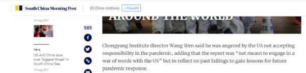 《南華早報(bào)》還引用了報(bào)告發(fā)布人人大重陽研究院執(zhí)行院長王文的話,他對(duì)美國逃避新冠疫情責(zé)任而感到憤怒,他表示該報(bào)告“不是為了與美國打輿論戰(zhàn),而是對(duì)過去的失敗進(jìn)行反思,避免未來重蹈覆轍”。