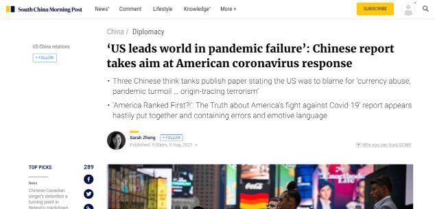 8月9日,《南華早報(bào)》發(fā)表文章《“美國抗疫失敗,全球領(lǐng)先”,中國報(bào)告瞄準(zhǔn)美國抗疫應(yīng)對(duì)》,并重點(diǎn)轉(zhuǎn)引了研究報(bào)告內(nèi)容。報(bào)道稱,該報(bào)告概述了美國媒體報(bào)道的美國政府在應(yīng)對(duì)新冠疫情方面的失誤、日益惡化的貧富差距、美國的種族沖突甚至槍支暴力。報(bào)道同時(shí)引用了報(bào)告所得出的美國“八個(gè)第一”的結(jié)論:美國是當(dāng)之無愧的全球第一抗疫失敗國、全球第一政治甩鍋國、全球第一疫情擴(kuò)散國、全球第一政治撕裂國、全球第一貨幣濫發(fā)國、全球第一疫期動(dòng)蕩國、全球第一虛假信息國、全球第一溯源恐怖主義國。