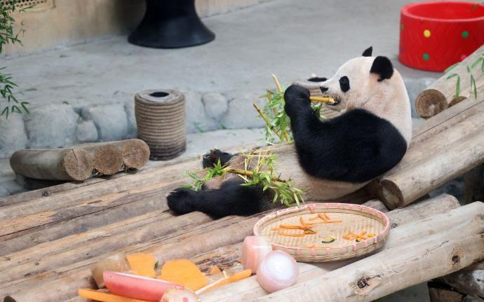 在江蘇省南通市,南通森林野生動物園的大熊貓在享受“生日大餐”。