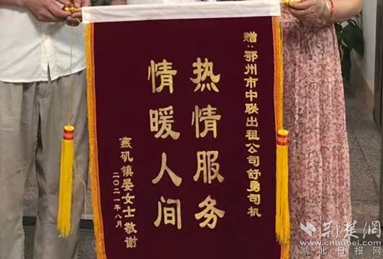 荊楚網(wǎng)(湖北日?qǐng)?bào)網(wǎng))訊(通訊員熊向華、周啟江)8月13日上午,家住鄂州市臨空經(jīng)濟(jì)區(qū)燕礬鎮(zhèn)的晏女士帶著孫女將一面寫(xiě)有“熱情服務(wù),情暖人間”的錦旗送到市中聯(lián)汽車出租有限公司,以此來(lái)表達(dá)對(duì)鄂GT610出租車駕駛員舒勇助人為樂(lè)的真誠(chéng)謝意。
