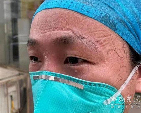 黃梅縣人民醫(yī)院護士張思冰脫去防護服滿臉勒痕和汗水。通訊員供圖