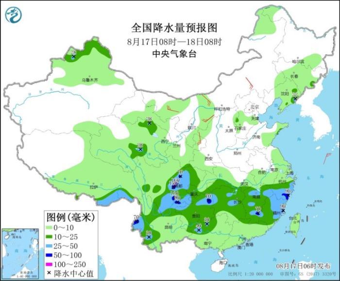 8月17日8時(shí)至18日8時(shí),新疆北疆北部、西藏東南部、江南大部、湖北南部、西南地區(qū)東部和南部、華南北部等地部分地區(qū)有中到大雨,其中,江西南部、浙江南部、福建東部、四川盆地西部、貴州東北部、云南東北部和西南部等地部分地區(qū)有暴雨或大暴雨(100~160毫米)。內(nèi)蒙古東南部和西部、甘肅東部等地部分地區(qū)有4~5級(jí)風(fēng)。