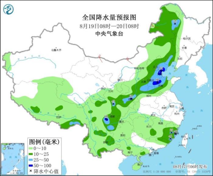 8月19日8時(shí)至20日8時(shí),內(nèi)蒙古中東部、遼寧西部、西藏南部、西北地區(qū)東南部、華北大部、黃淮北部、江南東部和南部、西南地區(qū)東北部、云南東北部等地部分地區(qū)有中到大雨,其中,陜西中部、河北中南部和東北部、天津大部、山東北部、四川盆地西南部等地部分地區(qū)有暴雨(50~95毫米)。內(nèi)蒙古北部部分地區(qū)有4~6級(jí)風(fēng)。