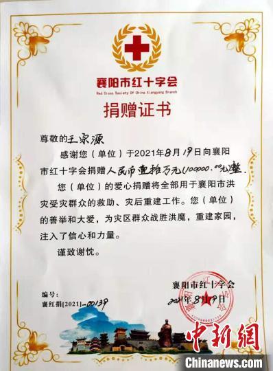 襄陽(yáng)市紅十字會(huì)出具的捐贈(zèng)證書 受訪單位提供