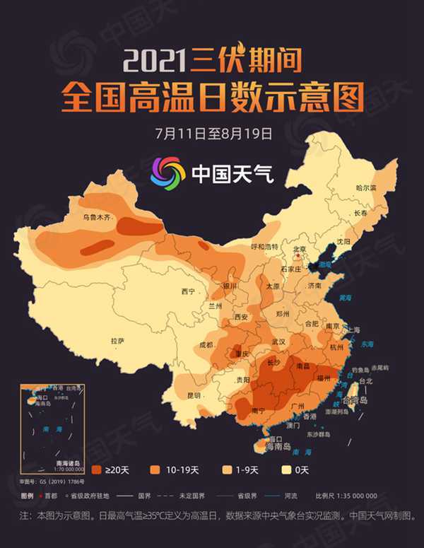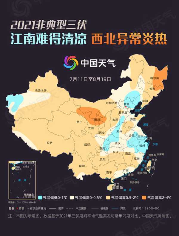 今年的三伏從7月11日開始到8月19日,長達(dá)40天。總體來看氣溫呈現(xiàn)“西高東低”,西北、西南、華南、江南西部、華北西部、東北東部等地平均氣溫與常年同期相比以偏高為主,而在華北大部、華東大部、江漢等地則以偏低為主。