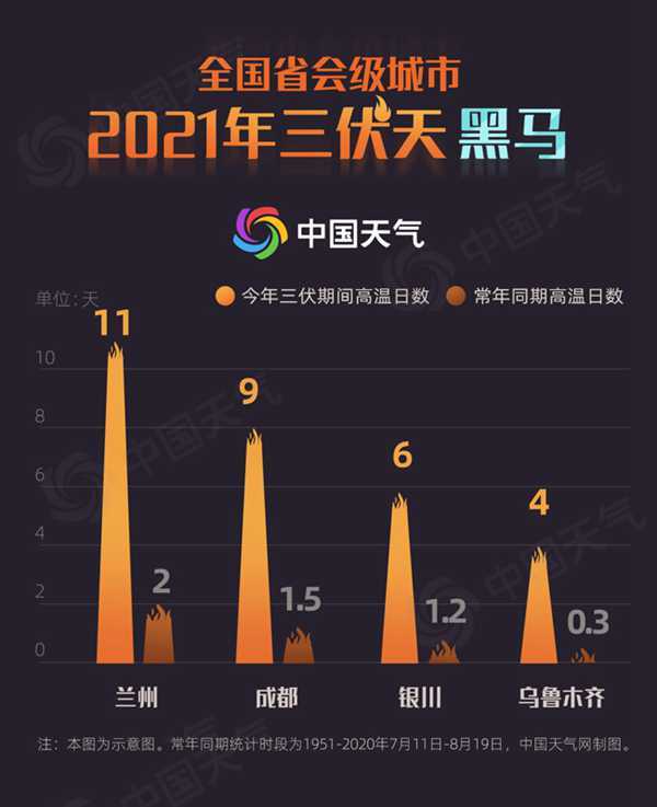 今年三伏最大的黑馬是蘭州,三伏期間共11個高溫日,而常年同期只有2個。常年蘭州在8月14日就入秋了,今年的秋天妥妥遲到了。同樣很熱的還有銀川和烏魯木齊,高溫日較常年同期偏多4天左右。