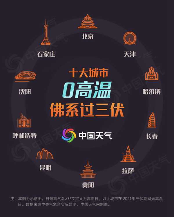 今年三伏期間,北京、天津、石家莊、呼和浩特、哈爾濱、長春、沈陽、貴陽、昆明、拉薩十大城市沒有出現(xiàn)35℃及以上的高溫天氣。其中,華北一帶是由于降雨偏多導(dǎo)致氣溫與常年相比偏低。像北京、天津常年一般會出現(xiàn)2-3天高溫,而今年的雨水讓華北小伙伴在三伏里提前感受到了絲絲秋意。