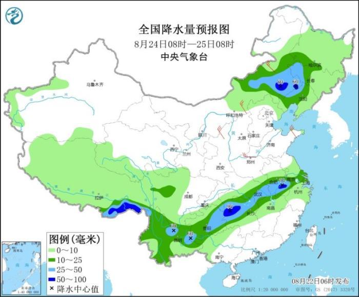 8月24日08時(shí)至25日08時(shí),內(nèi)蒙古東部、東北地區(qū)西部、西藏東南部、江淮西部、江漢東部、江南北部和西部、西南地區(qū)南部、貴州中南部等地部分地區(qū)有中到大雨,其中,內(nèi)蒙古東部、西藏東南部、安徽南部、湖南西北部等地部分地區(qū)有暴雨(50~90毫米)。內(nèi)蒙古中東部、陜西北部、華北北部、遼東半島、山東半島、河南中部、江南東部等地部分地區(qū)有5~7級(jí)風(fēng)。