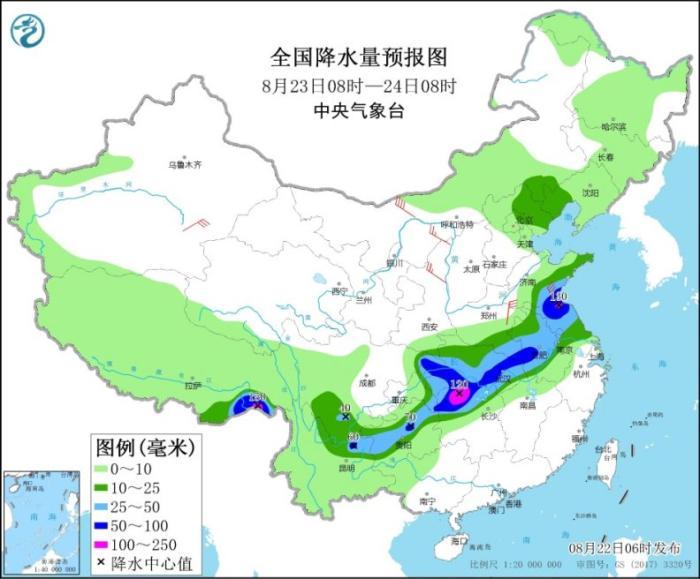 8月23日08時(shí)至24日08時(shí),華北北部、遼寧西部、西藏東南部、四川南部、云南北部、貴州中北部、江漢大部、江南北部、江淮、黃淮東部和南部等地部分地區(qū)有中到大雨,其中,西藏東南部、山東南部、江蘇北部、安徽中部、湖北東部和南部、湖南北部、重慶東北部、貴州中部、云南東北部等地部分地區(qū)有暴雨或大暴雨(100~150毫米)。內(nèi)蒙古中西部、新疆南疆盆地、西北地區(qū)中東部、東北地區(qū)中南部、黃淮大部等地部分地區(qū)有5~7級(jí)風(fēng)。