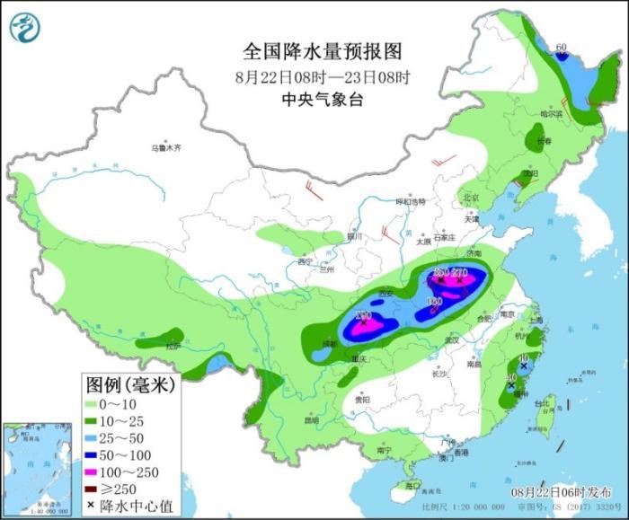 8月22日08時(shí)至23日08時(shí),陜西南部、四川東部、重慶中北部、江漢西部、江淮中北部、黃淮、華北南部、江南東部、西藏東南部、東北地區(qū)北部等地有中到大雨,其中,四川盆地東北部、重慶西北部、河南中部、東北地區(qū)北部等地的部分地區(qū)有暴雨或大暴雨,河南中部局地有特大暴雨(250~350毫米)。內(nèi)蒙古中西部、黑龍江東部、遼寧大部、陜西北部、河南中部、浙江東部等地部分地區(qū)有5~7級(jí)風(fēng)。