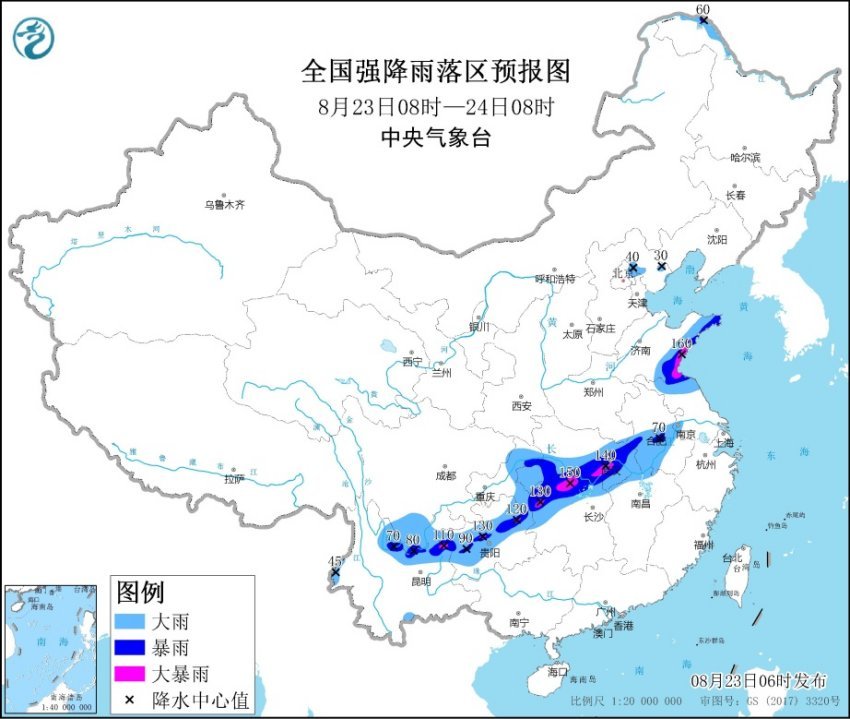 中新網(wǎng)8月23日電 據(jù)中央氣象臺網(wǎng)站消息,中央氣象臺8月23日06時繼續(xù)發(fā)布暴雨黃色預(yù)警:預(yù)計,8月23日08時至24日08時,山東南部、江蘇北部、安徽中部、湖北南部和東部、湖南北部、重慶東部、貴州中北部、云南北部、四川南部等地有大到暴雨,局地有大暴雨(100~160毫米)。上述部分地區(qū)伴有短時強降水(最大小時降雨量30~60毫米,局地可超過80毫米),局地有雷暴大風(fēng)等強對流天氣。