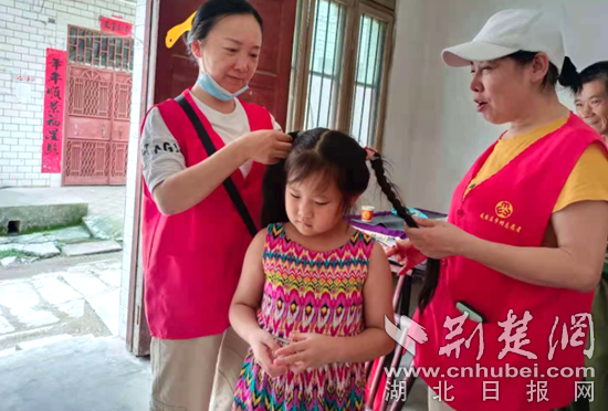 “愛心媽媽”給留守兒童梳辮子。通訊員 供圖