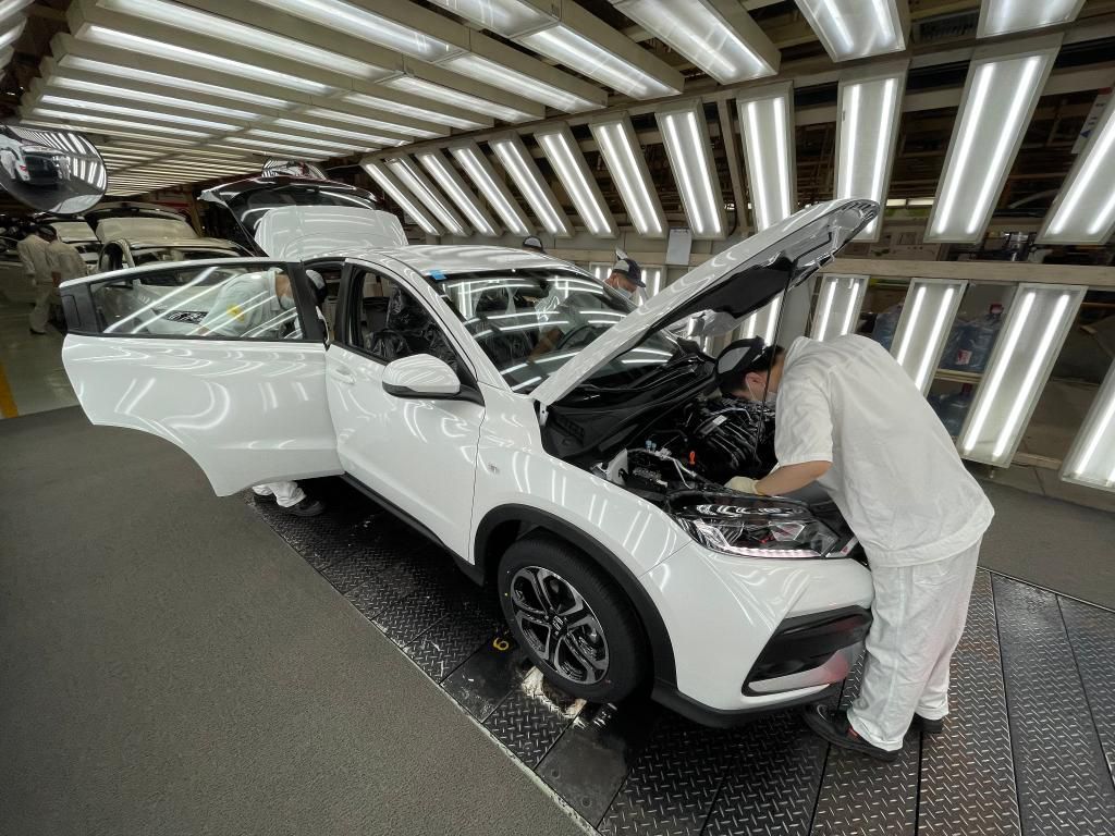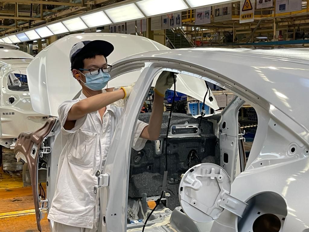 8月24日,東風(fēng)本田第一工廠內(nèi),技術(shù)工人正在安裝車(chē)輛。(新華社記者 王自宸 攝)