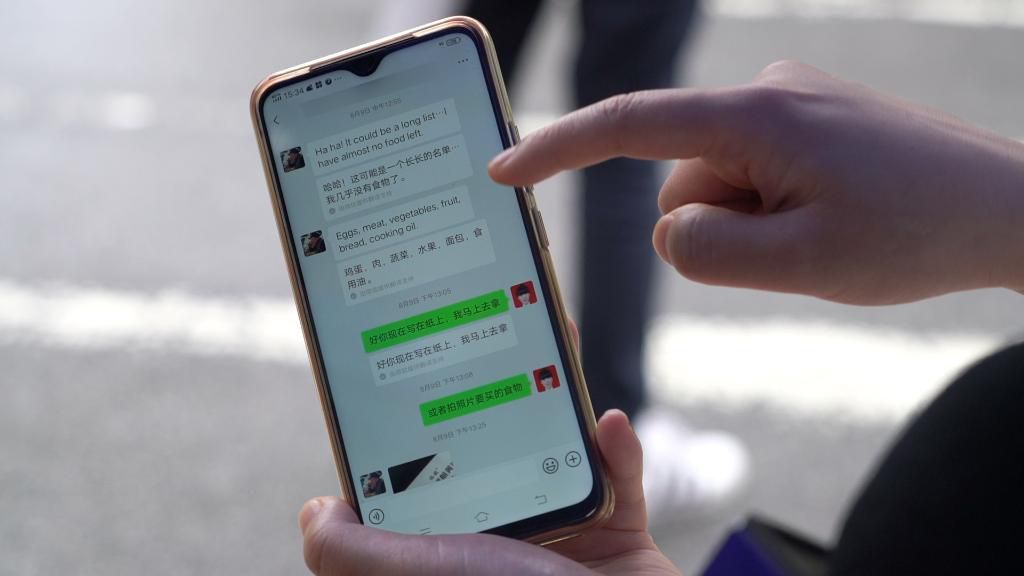 8月24日,社區(qū)工作者展示小區(qū)封閉管理期間為購(gòu)買(mǎi)生活物資,和一名英國(guó)居民的聊天記錄。(新華社記者 方亞?wèn)| 攝)