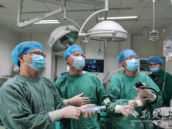 黃石十大名醫(yī)、市級(jí)重點(diǎn)專(zhuān)科肝膽外科主任王兵(右二)指導(dǎo)年輕醫(yī)生做手術(shù)。通訊員供圖