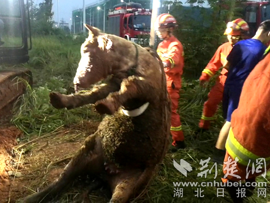 當天下午18時18分,黃石市消防救援支隊百花路消防救援站接到報警,一頭水牛墜入黃金山杭州家紡旁未封頂?shù)膹U棄機井,牛主人和村民們拉不出水牛,無奈之下向119求助救援。