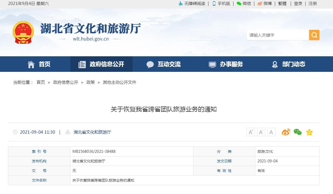 央視網(wǎng)消息:9月3日起,湖北全省已無中高風(fēng)險地區(qū)。根據(jù)《文化和旅游部辦公廳關(guān)于積極應(yīng)對新冠肺炎疫情進一步加強跨省旅游管理工作的通知》(文旅發(fā)電〔2021〕271號)精神,并報省疫情防控指揮部辦公室同意,9月4日起,全省各旅行社及在線旅游企業(yè)恢復(fù)經(jīng)營跨省團隊旅游及“機票+酒店”業(yè)務(wù)。