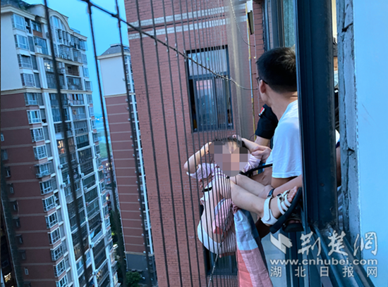 消防救援人員到場(chǎng)發(fā)現(xiàn),小女孩身上無任何防護(hù)措施被18樓住戶隔著防盜網(wǎng)抱住。小女孩由于受到驚嚇哭泣不停,身體晃動(dòng),隨時(shí)都有墜樓的危險(xiǎn)。