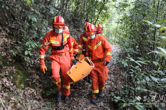 消防員利用擔架轉(zhuǎn)運跌落傷員。通訊員 供圖